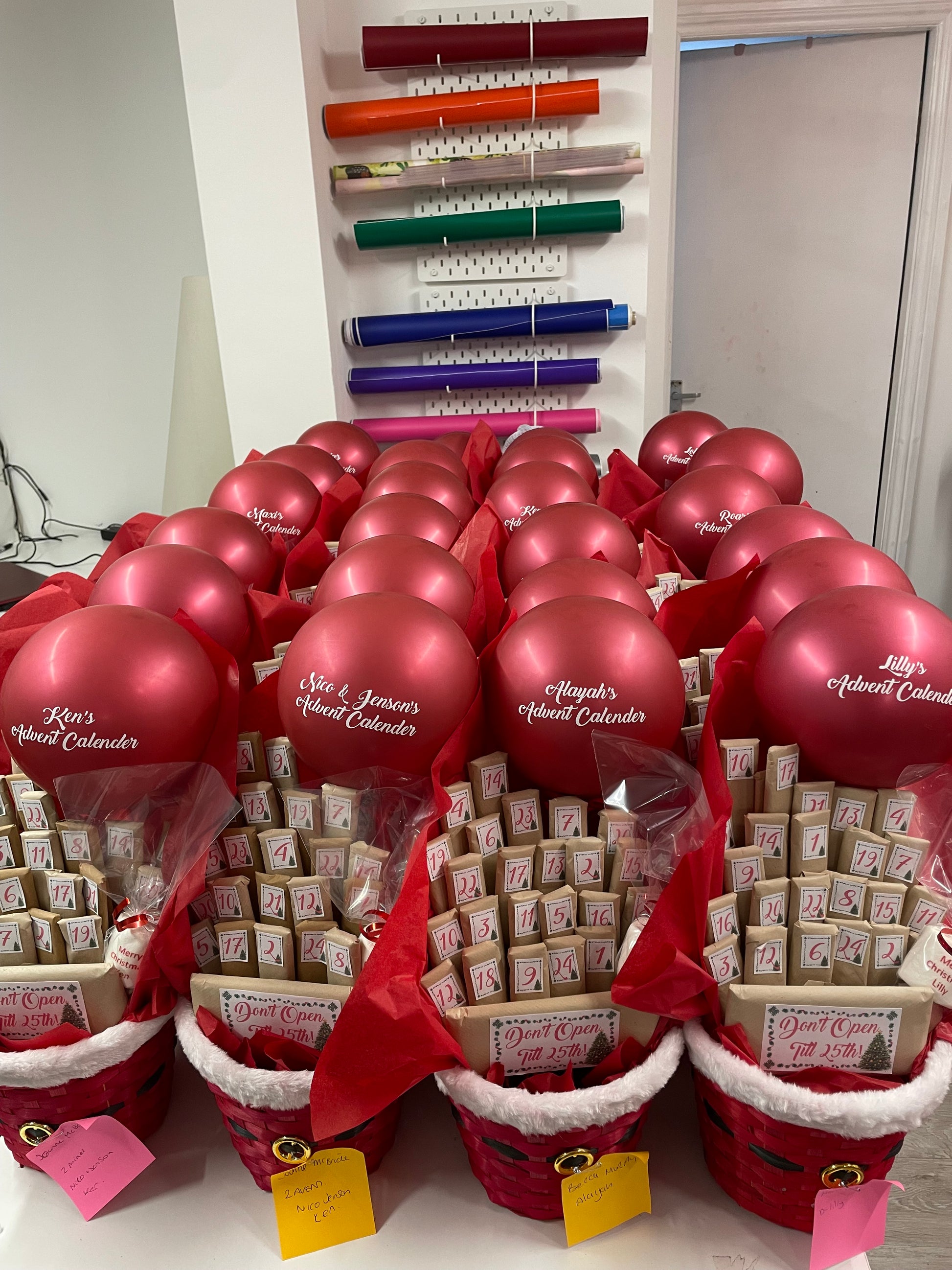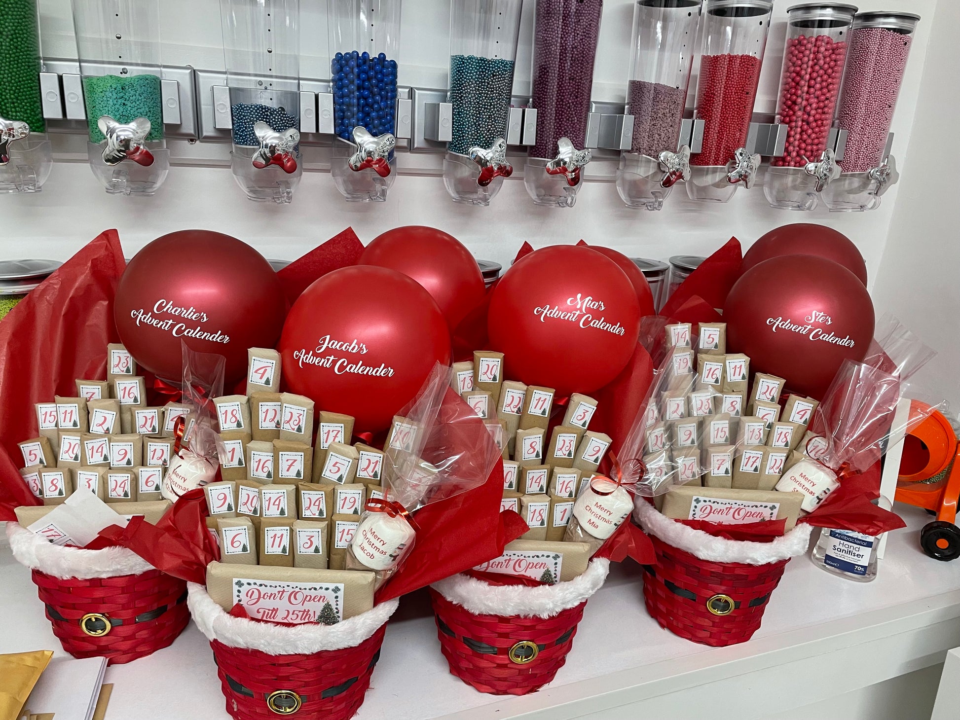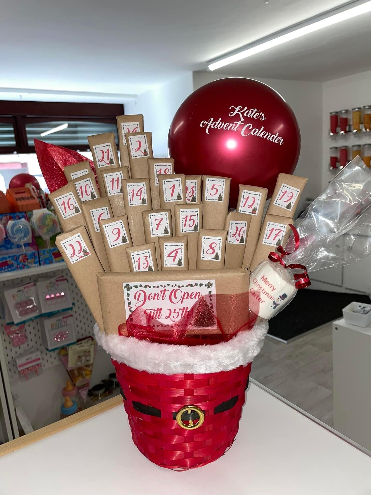 Personalised advent calendars are 24 little bars of either Dairy Milk or Milkybar and then 1 big bar of your chosen chocolate bar plus a hot chocolate cone with a personalised marshmallow for Christmas Eve!