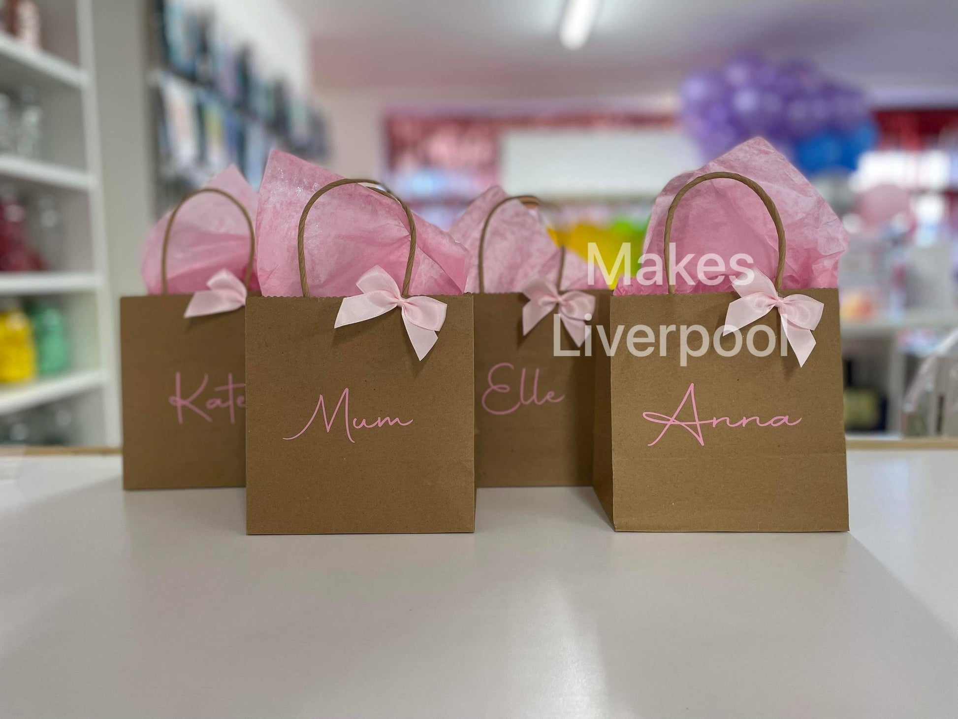 Brown craft bag personalised comes complete with bow and tissue paper.
